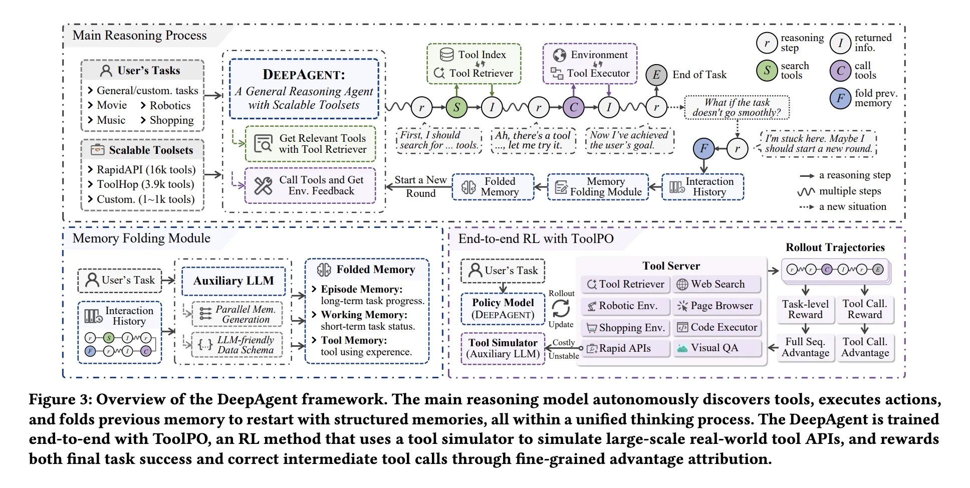 Long sequences of tool calls, web results, and code responses will overflow the context. DeepAgent solves this with an autonomous memory folding step. When the model emits the fold token, an auxiliary LLM compresses the full history into three memories, Episodic Memory that records task events, Working Memory that records the current sub goal and recent issues, and Tool Memory that records tool names, arguments, and outcomes. These memories are fed back as structured text, so the agent continues from a compact but information rich state.