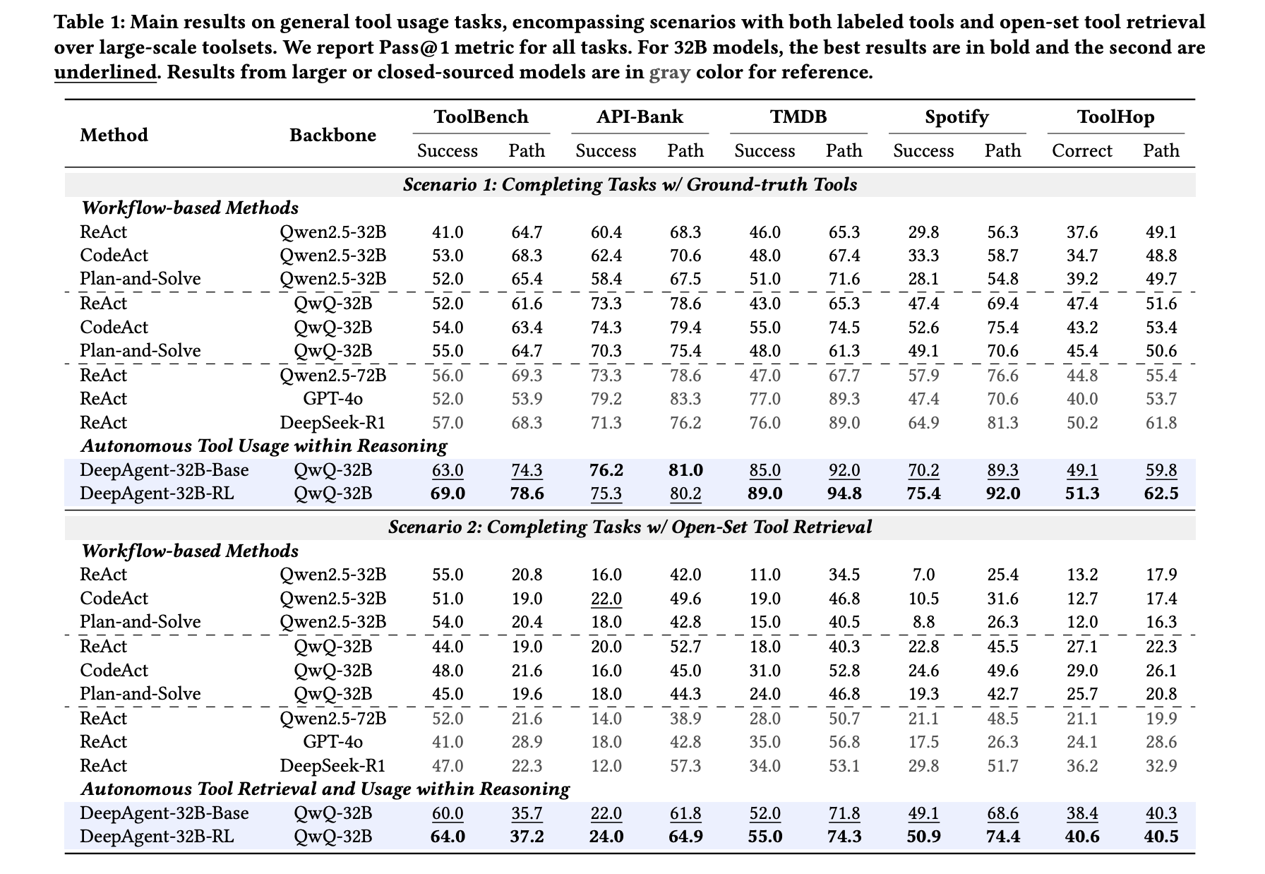 The research team evaluates on 5 general tool use benchmarks, ToolBench, API Bank, TMDB, Spotify, ToolHop, and on 4 downstream tasks, ALFWorld, WebShop, GAIA, HLE. In the labeled tool setting, where every method is given the exact tools it needs, DeepAgent 32B RL with a QwQ 32B backbone reports 69.0 on ToolBench, 75.3 on API Bank, 89.0 on TMDB, 75.4 on Spotify, and 51.3 on ToolHop, which is the strongest 32B level result across all 5 datasets. Workflow baselines such as ReAct and CodeAct can match single datasets, for example ReAct with strong models is high on TMDB and Spotify, but none of them stay high on all 5, so the fair summary is that DeepAgent is more uniform, not that others are always low.