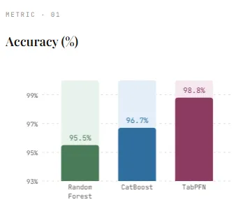 Across our experiments, TabPFN delivers the strongest overall performance, achieving the highest accuracy (98.8%) while requiring virtually no training time (0.47s) compared to Random Forest (9.56s) and CatBoost (8.15s). This highlights its key advantage: eliminating dataset-specific training and hyperparameter tuning while still outperforming well-established tree-based methods. However, this benefit comes with a trade-off—inference latency is significantly higher (2.21s), as the model processes both training and test data together during prediction. In contrast, CatBoost and Random Forest offer much faster inference, making them more suitable for real-time applications.