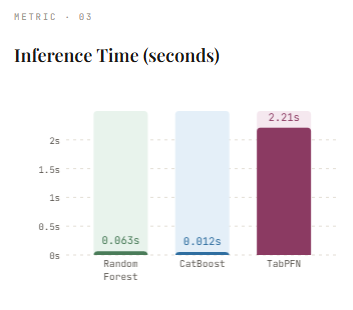 Finally, we evaluate TabPFN, which takes a fundamentally different approach compared to traditional models. Instead of learning from scratch on the dataset, it leverages a pretrained model and simply conditions on the training data during inference. The .fit() step mainly involves loading the pretrained weights, which is why it is extremely fast.