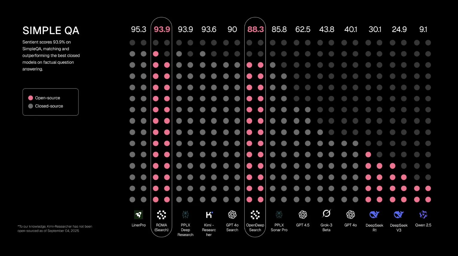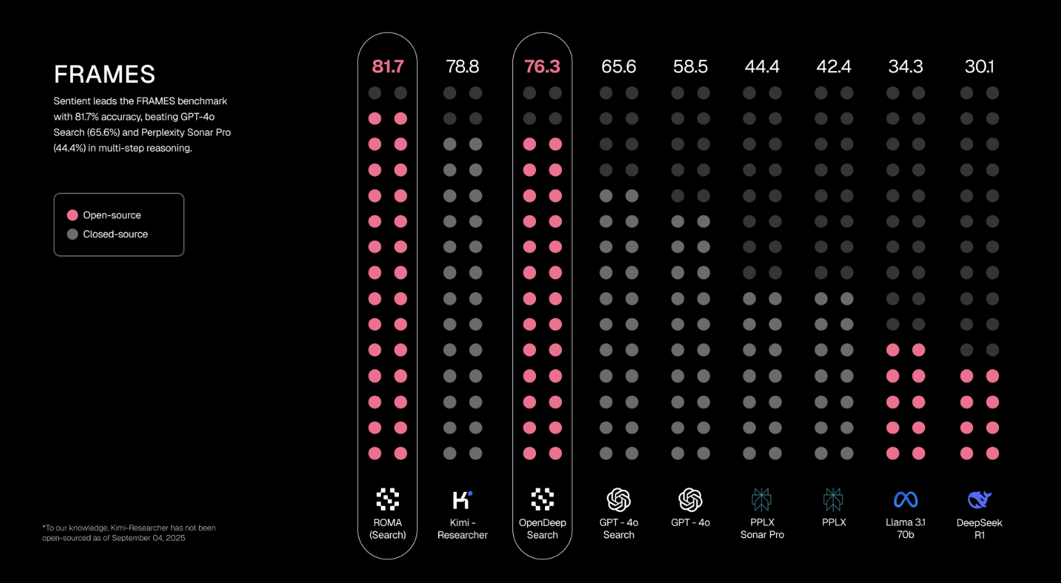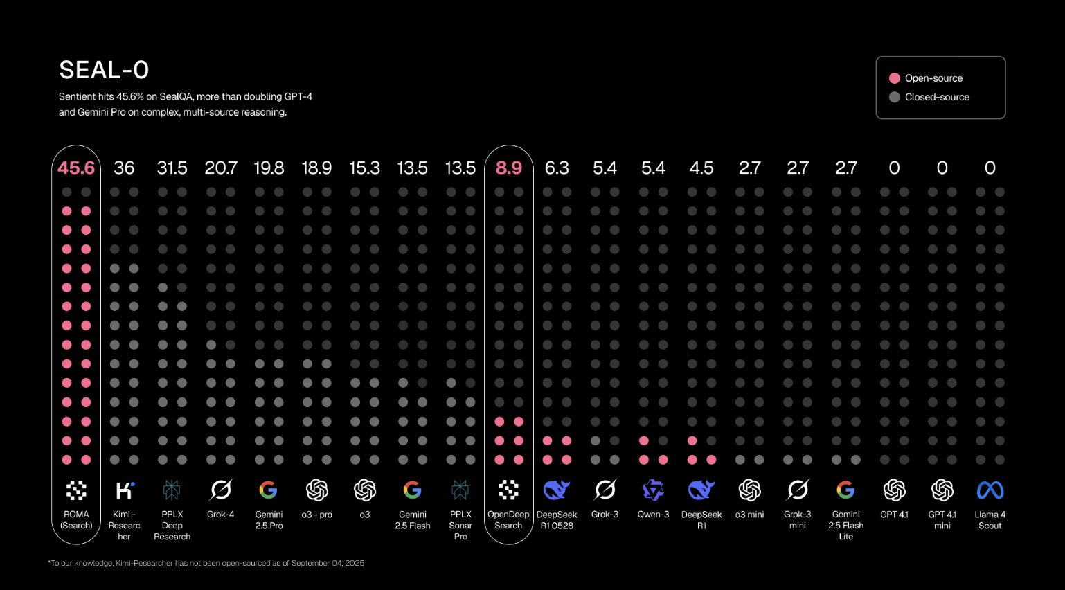 To validate the architecture, Sentient built ROMA Search, an internet search agent implemented on the ROMA scaffold (no domain-specific “deep research” heuristics claimed). On SEALQA (Seal-0)—a subset designed to stress multi-source reasoning—ROMA Search is reported at 45.6% accuracy, exceeding Kimi Researcher (36%) and Gemini 2.5 Pro (19.8%). The ROMA also reports state-of-the-art on FRAMES (multi-step reasoning) and near-SOTA on SimpleQA (factual retrieval). As with all vendor-published results, treat these as directional until independently reproduced, but they show the architecture is competitive across reasoning-heavy and fact-centric tasks.