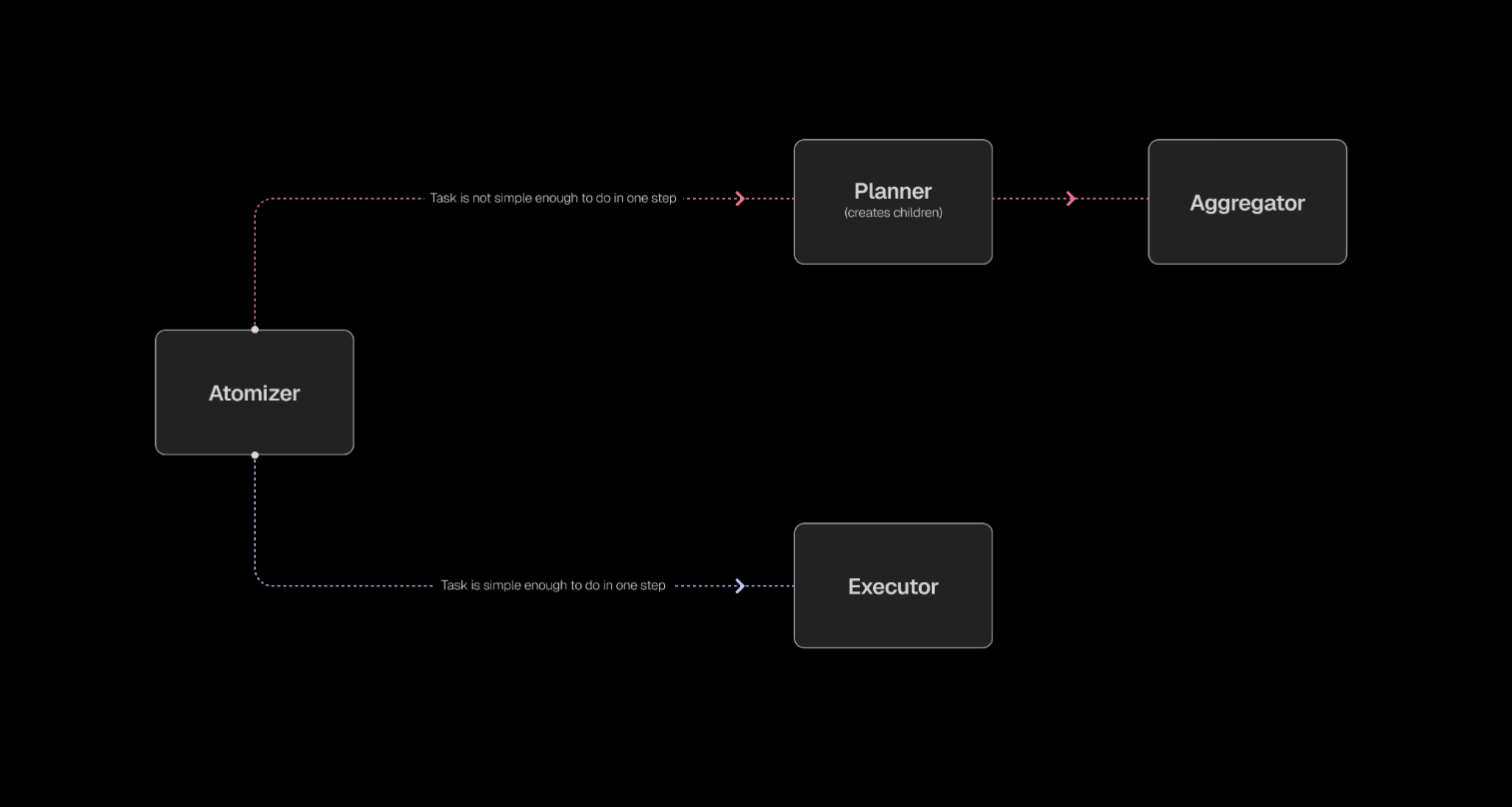 ROMA defines a minimal, recursive control loop. A node first atomizes a request (atomic or not). If non-atomic, a planner decomposes it into subtasks; otherwise, an executor runs the task via an LLM, a tool/API, or even a nested agent. An aggregator then merges child outputs into the parent’s answer. This decision loop repeats for each subtask, producing a dependency-aware tree that executes independent branches in parallel and enforces left-to-right ordering when a subtask depends on a previous sibling.